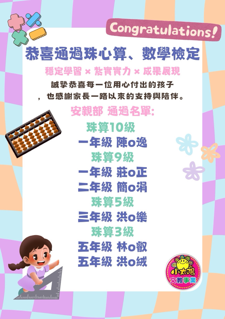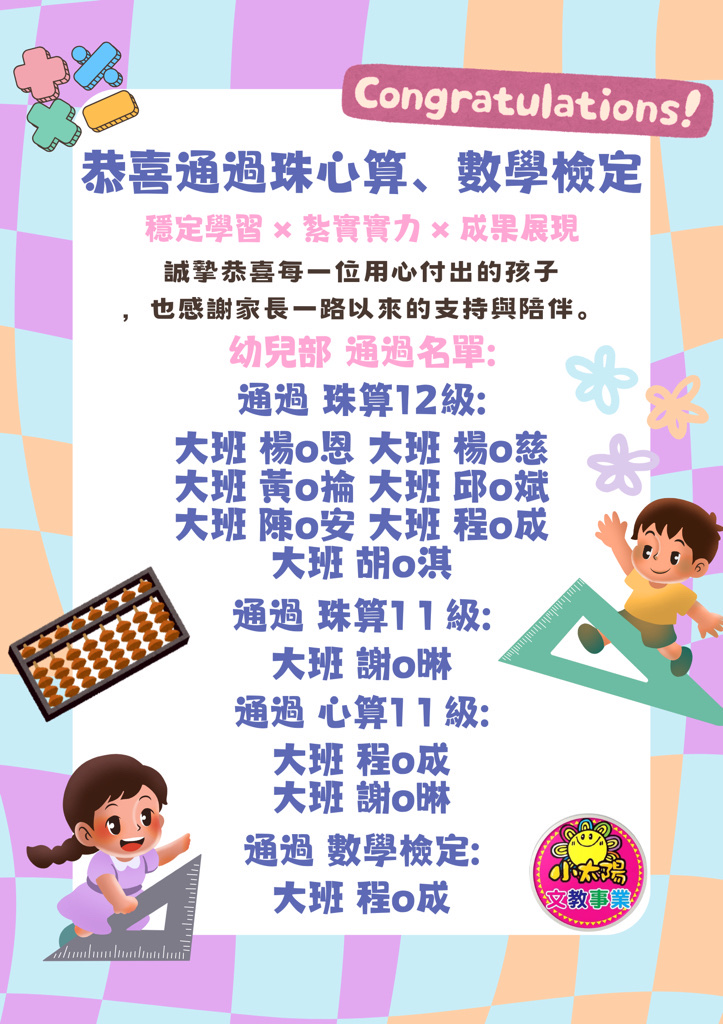 賀賀賀~ 幼兒部、國小部:數學、珠算、心算檢定通過
